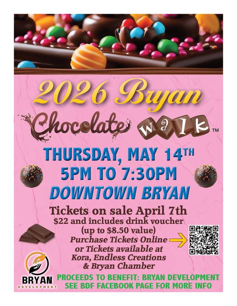 Stroll through downtown Bryan while collecting a variety of chocolate treats from participating businesses. This delicious event benefits the Bryan Development Foundation. Tickets must be purchased in advance, and this event is sure to sell out. Purchase tickets online or at Kora Brew House & Wine Bar, Endless Creations or the Bryan Area Chamber of Commerce.