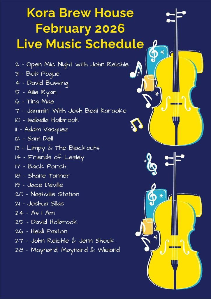 Listen to live music at Kora Brew House & Wine Bar all month long! Performances run 6-8 p.m. on Tuesday, Wednesday and Thursday and 6:30-9:30 p.m. on Friday and Saturday.