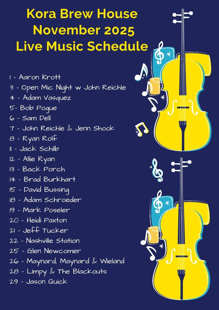 Listen to live music at Kora Brew House & Wine Bar all month long! Performances run 6-8 p.m. on Tuesday, Wednesday and Thursday and 6:30-9:30 p.m. on Friday and Saturday.