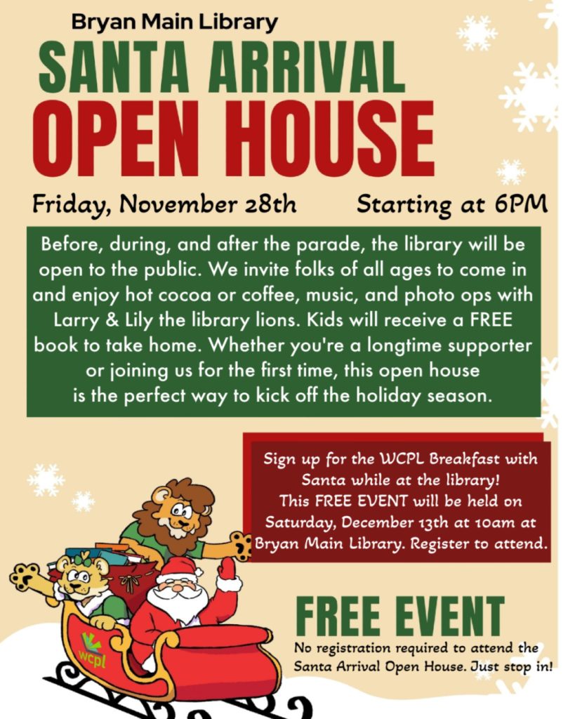 Warm up with hot cocoa or coffee & listen to festive music before, during and after the Santa Arrival Parade around the square. Kids can also receive a free book to take home! No registration is required for this free event.